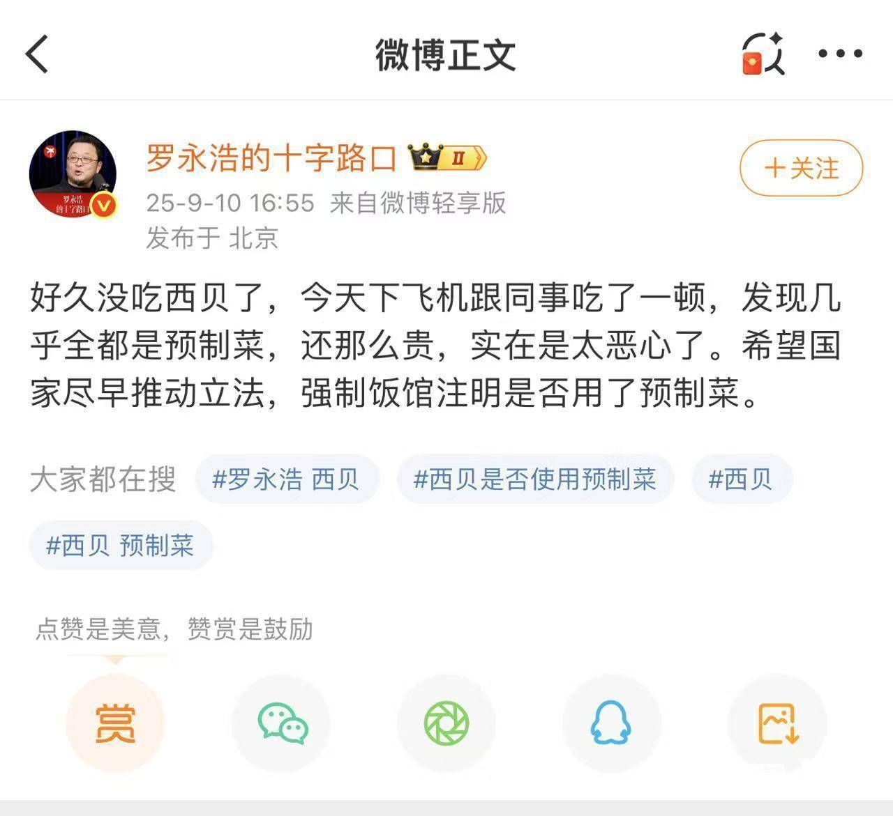 此次风浪源于9月11日罗永浩到西贝一店后发布的微博。9月11日,罗永浩发布微博称,许久没吃西贝,成果他发觉西贝几乎全都是预制菜,“还那么贵,实正在是太恶心了”。他但愿国度尽早鞭策立法,强制饭店说明能否用了预制菜。